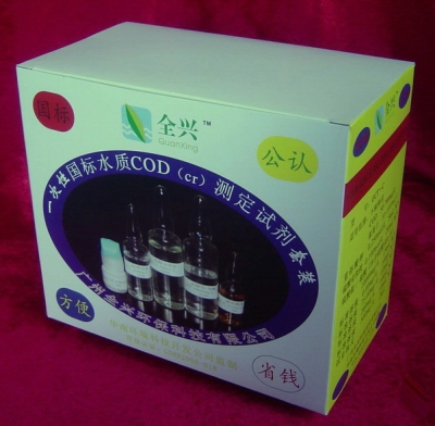 以重铬酸钾为氧化剂测定水质化学需氧的方法 ,简称COD(cr),国家标准GB11914-89有明确阐述并被誉为经典方法。该法适用面广、精度高、无须作标准曲线,尤其水质状况较差含有悬浮、色度和氯离子等工业污水更是别无选择。但该法也有不足之处,测定中消解过程耗时、耗能和耗水比较严重,但采用微波消解已基本解决。再则是试剂的配制、取用计量及不便携带等方面仍须改进。配制过程需几天时间配制量通常较多,对于样品批量不大的用户,短期内不能用完(一星期左右)经常会被废弃,造成浪费和环境污染。流动或野外作业时更有不适之感:体积、重量偏大和容器损坏伤人(内含浓硫酸)的危险。一次性水质COD(cr) 测定试剂套装正是基于上述不足而推出的新产品,为广大从事环保人士提供了方便和节约的选择。