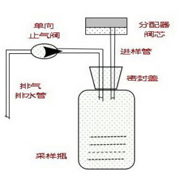 采样瓶进样、溢流和排气如何在密封条件下实现的。采样瓶的进样口由分配器阀芯密封。排气口供瓶内減压和溢流使用,经过只出不进的单向阀与外界空气隔断,使采样瓶内样品处于密封状态。如图9所示: